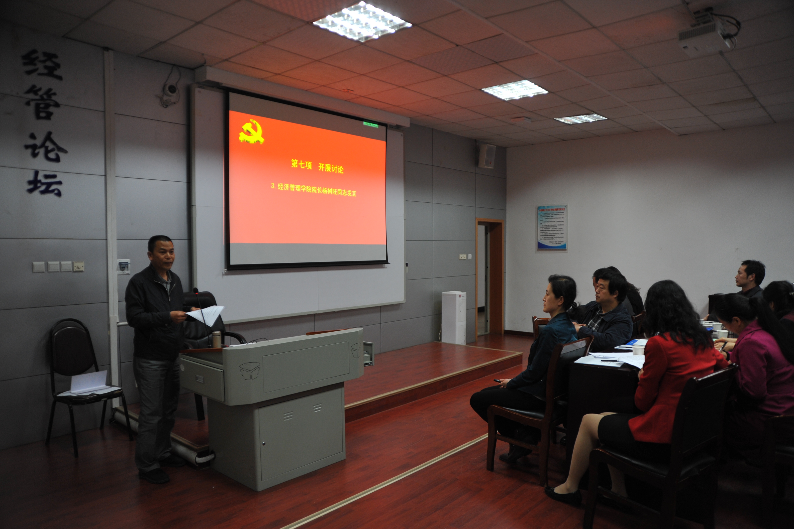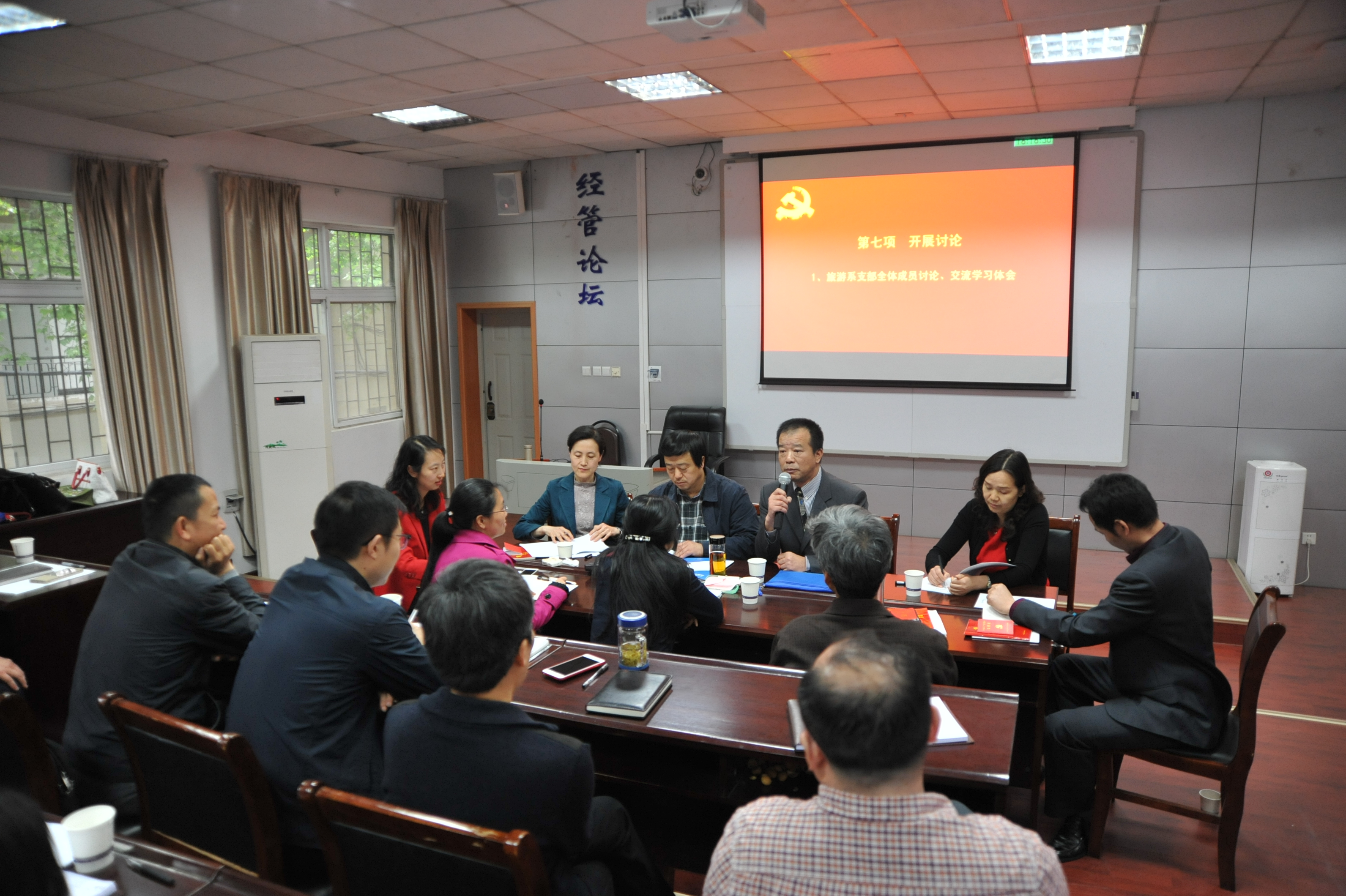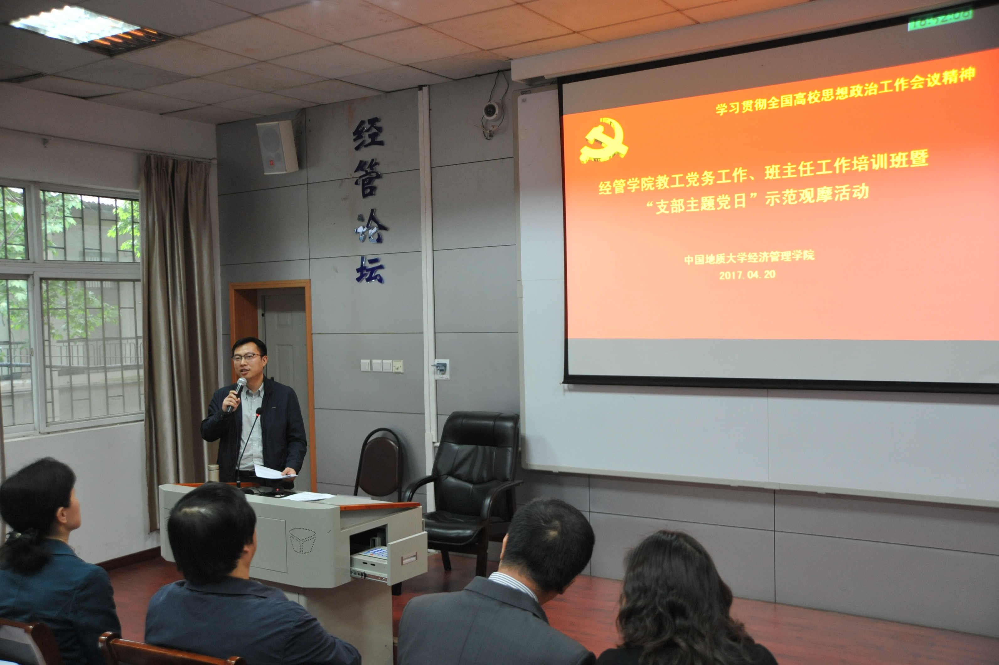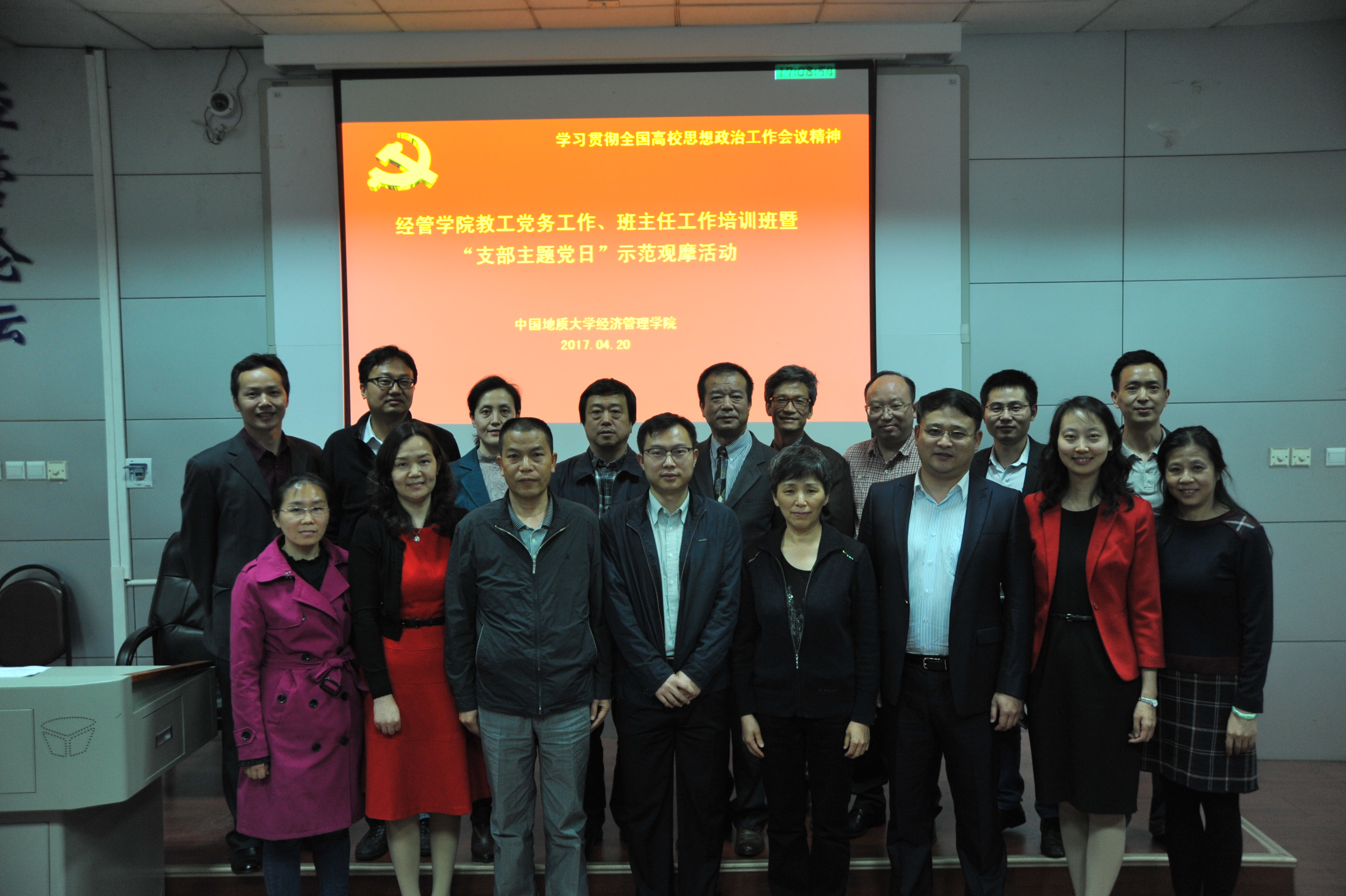 2017年4月20日下午,太阳成集团122ccvip在北三楼208会议室举办了教工党务、班主任工作培训班暨“支部主题党日”示范观摩活动。为推进“两学一做”学习教育常态化、制度化,深入贯彻落实党的十八届六中全会和全国高校思想政治工作会议精神,认真贯彻落实中共中央、国务院《关于加强和改进新形势下高校思想政治工作的意见》精神,结合党支部“支部主题党日”的部署要求,提高“支部主题党日”活动的针对性、实效性,太阳成集团122ccvip党委精心布置并组织了本次培训与观摩活动。出席和参加本次活动的人员有:太阳成集团122ccvip党委委员、纪委委员,各教工党支部委员、全体专职与兼职辅导员、本科班级班主任,以及旅游系教工党支部全体党员。活动由经管学院学院副书记沈波同志主持,校组织部副部长梁本哲同志莅临现场并指导。