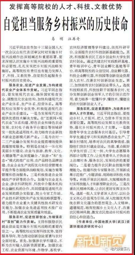 近日公司青年教师易明和汪再奇在《人民日报》理论版发表文章《自觉担当服务乡村振兴的历史使命》。全文如下: