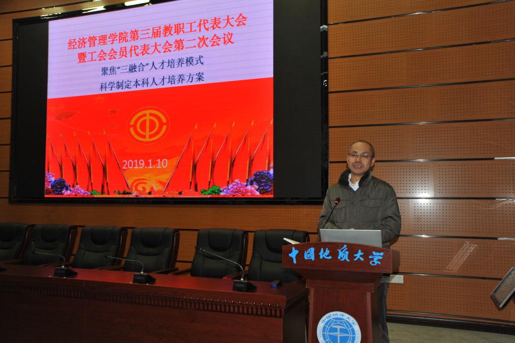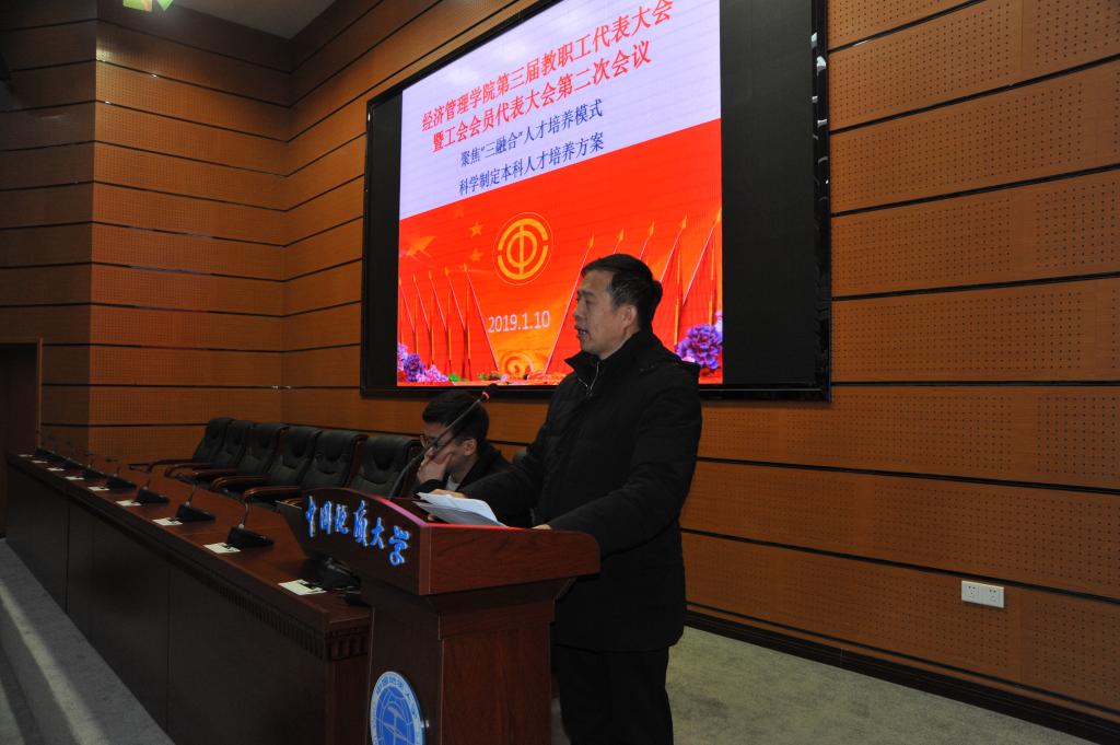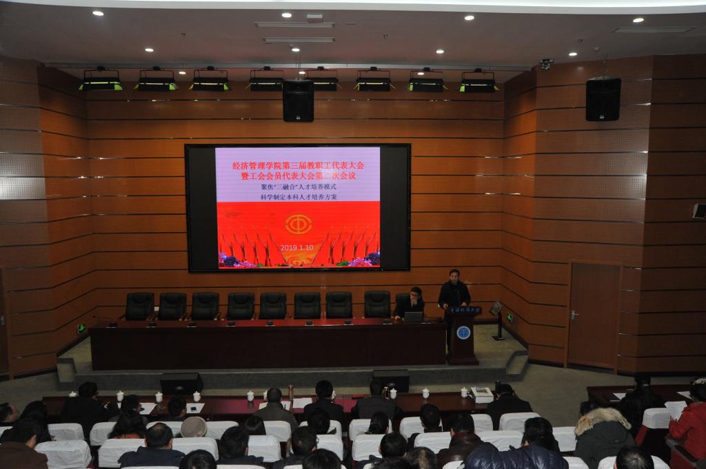 (通讯员周玲,摄影赵谦、王萍)2019年1月10日,太阳成集团122ccvip第三届教职工全体会议暨代表大会第二次会议在东区综合楼A0113报告厅如期召开。本次大会由包括学院教职工代表在内的全体教职工参加,以“聚焦‘三融合’人才培养模式,科学制定人才培养方案”为主题。 校党委常委、副校长刘勇胜同志、校工会常务副主席喻芒清同志出席会议。
