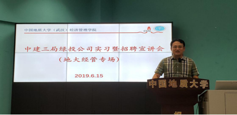 (通讯员:学生记者叶德兆)6月15日上午9:30,中建三局绿投公司实习暨招聘宣讲会在北一楼报告厅举行。中建三局绿投公司合约法务部负责人胡谋东,人力资源部副总监梅伟,公司2017级毕业生喻宏一行来校开展地大经管学院专场实习暨招聘宣讲活动。学院党委副书记沈波,管理科学与工程系主任王广民,系党支部书记孙涵,管科系宫培松、丁丽萍、张先锋、冯忠磊、程欣等老师出席了活动。