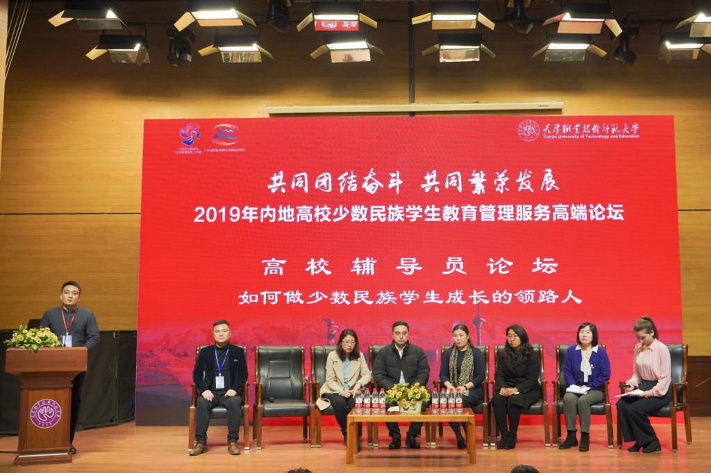 近日,2019年内地高校少数民族学生教育管理服务高端论坛在天津举行,本次论坛主题为“共同团结奋斗 共同繁荣发展”,来自全国109所高校的400余名专家学者、统战部部长、学工部部长、少数民族专职辅导员参加论坛。天津市委常委、统战部部长冀国强,教育部民族教育发展中心副主任胡炜,广东省委教育工委副书记、省教育厅党组副书记李大胜等出席开幕式并讲话。公司辅导员努尔夏提·居勒提受邀参加论坛并发言交流。