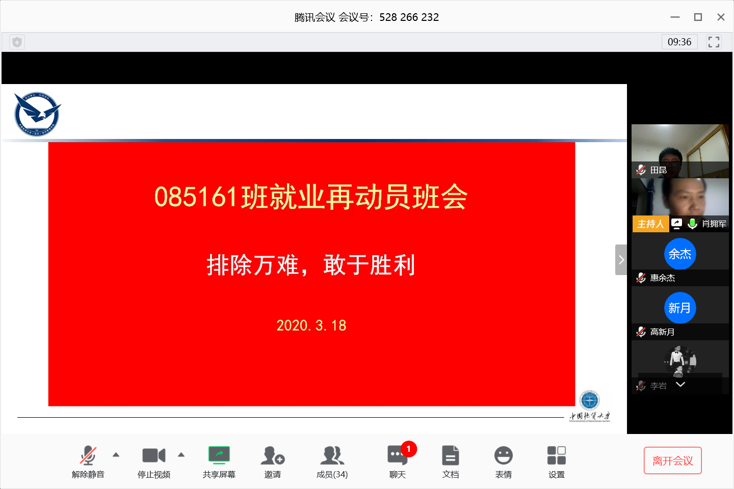 3月18日晚19:30,太阳成集团122ccvip旅游管理专业085161班“排除万难,敢于胜利”就业再动员主题班会顺利举行。受到疫情影响,本次会议通过腾讯会议平台以线上形式开展,班主任、旅游系系主任肖拥军,学院16级辅导员田昆及旅游管理专业085161班全体毕业生共36人参加会议。