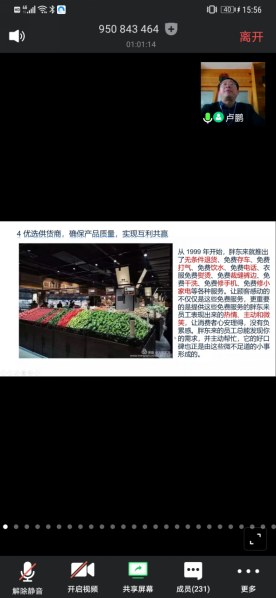 本次活动开始由卢鹏老师主讲,他以《胖东来集团公司成功的硬核》为题。从胖东来集团的发展历程、管理方式以及公司运营模式等方面向同学们介绍了胖东来集团得以成功的关键。卢鹏老师着重讲述公司创始人主动承担社会责任的爱国主义精神,探讨公司“让员工当老板”的服务理念,分析公司开拓“新零售”市场经验等,使同学们了解不少干货。