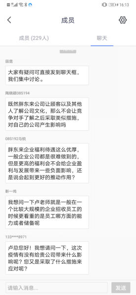 交流环节中,工商管理系教师与卢鹏老师一同就胖东来集团的商业伦理、公司文化、经营管理、突发事件应对、学生求职选择、能力培养等问题与同学们展开积极讨论。
