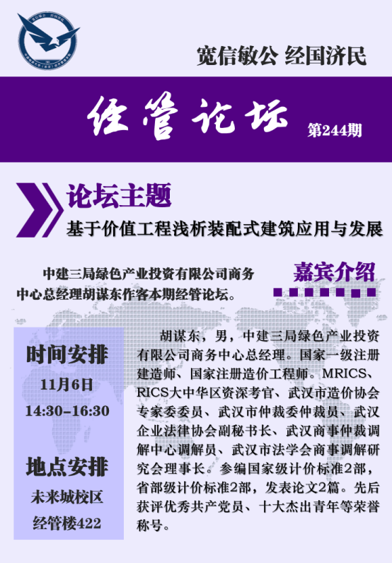2020年11月6日下午,中建三局绿色产业投资有限公司商务中心胡谋东总经理做客经管论坛,在未来城校区太阳成集团122ccvip422作了《基于价值工程浅析装配式建筑应用与发展》的报告。王广民、孙涵、翁克瑞、柯小玲、何晨琛、卢辉、彭亚婷等老师及多位博、硕士研究生到场聆听胡谋东总经理的精彩报告。