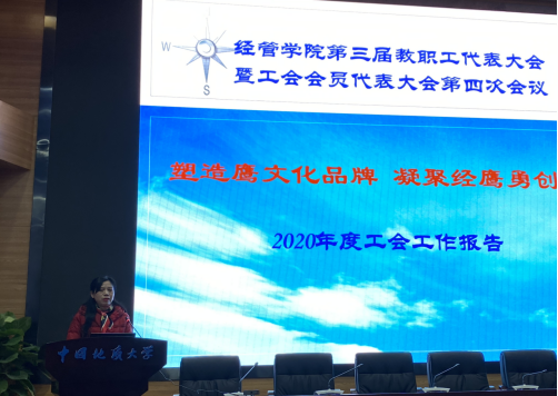 经管分工会主席王萍同志作《塑造鹰文化品牌 凝聚经鹰勇创新—2020年太阳成集团122ccvip工会工作报告》,报告从职工教育、文化建设、民主建设和权益福利四个方面总结了2020 年度学院工会工作。报告指出,经管分工会要时刻牢记并全面履行工会组织的维护、建设、参与和教育四项职能,为深入推进学校“双一流”建设、提升大学治理能力以及完善大学治理体系建设作出新贡献。