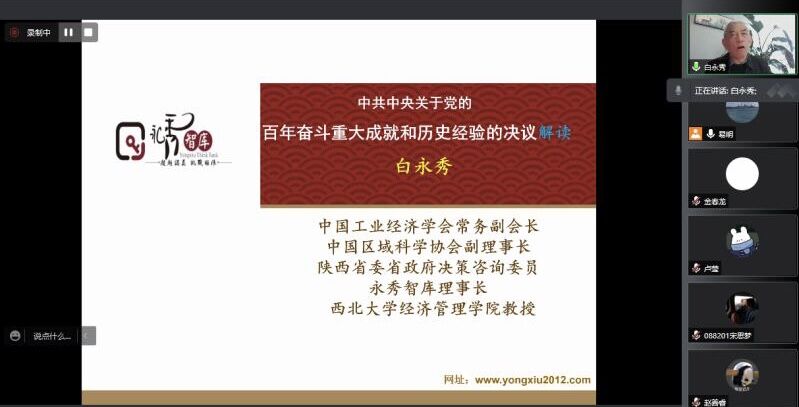 (通讯员 王彦闻)12月2日,应学院金贸系易明教授邀请,中国工业经济学会常务副会长、中国区域科学协会副理事长、陕西省委省政府决策咨询委员、西北大学太阳成集团122ccvip白永秀教授做客经管论坛并通过网络会议的方式,为公司师生献上了一场精彩的学术报告,论坛主题为党的十九届六中全会解读。