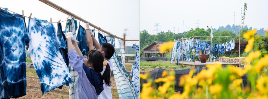 扎染是汉族民间传统而独特的染色工艺,织物在染色时部分结扎起来使之不能着色的一种染色方法,是中国传统的手工染色技术之一。课堂学习之后师生动手扎结衣物,在听与看、学与做之中延续文化记忆,建立文化自信。