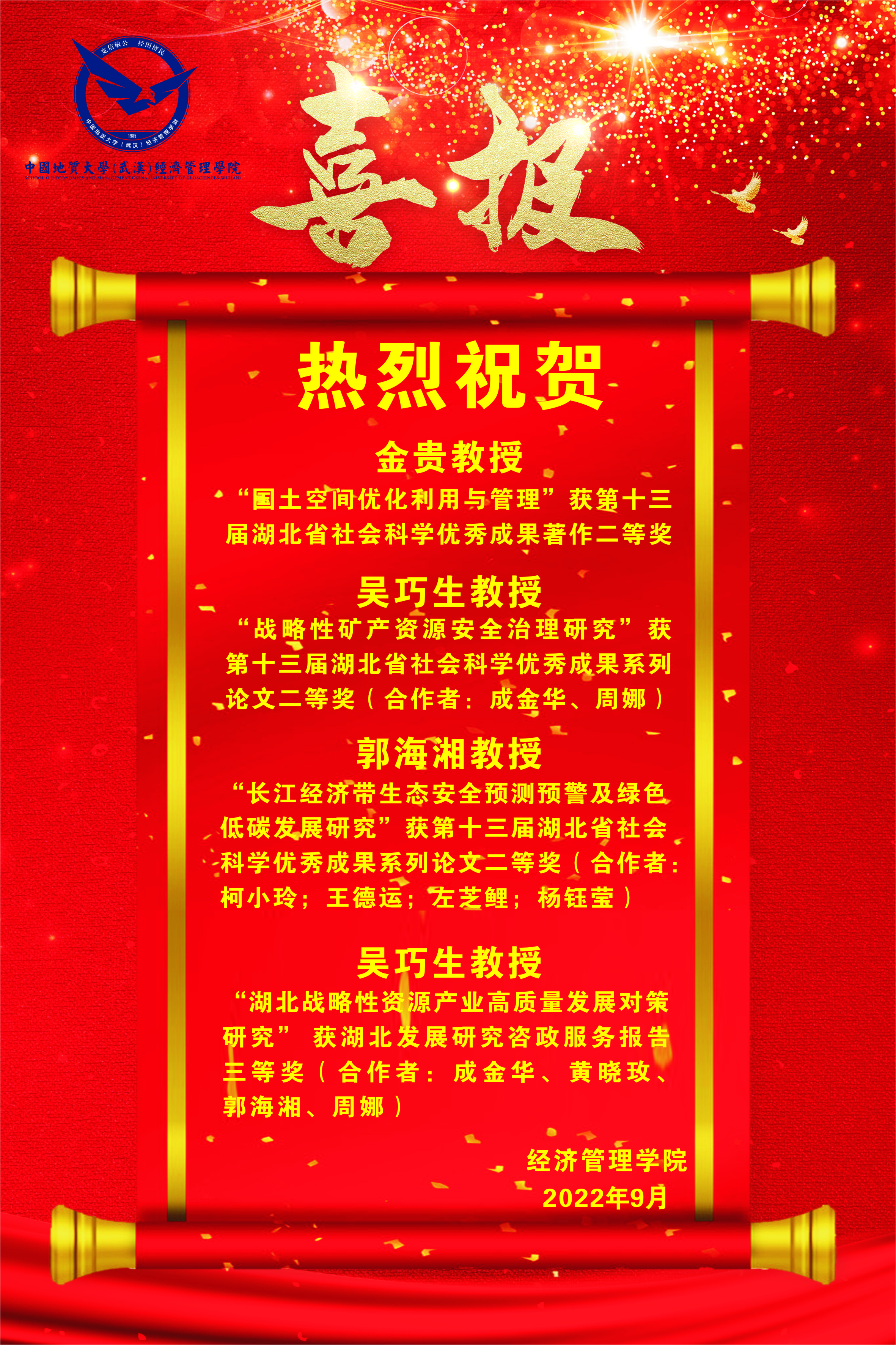 近日,第十三届湖北省社会科学优秀成果奖获奖名单和湖北省发展研究奖(2020—2021年)获奖名单公布,学校共获得一等奖1项,二等奖4项,三等奖5项。其中,公司吴巧生教授、金贵教授、郭海湘教授分别获第十三届湖北省社会科学优秀成果二等奖,吴巧生教授获湖北发展研究三等奖。