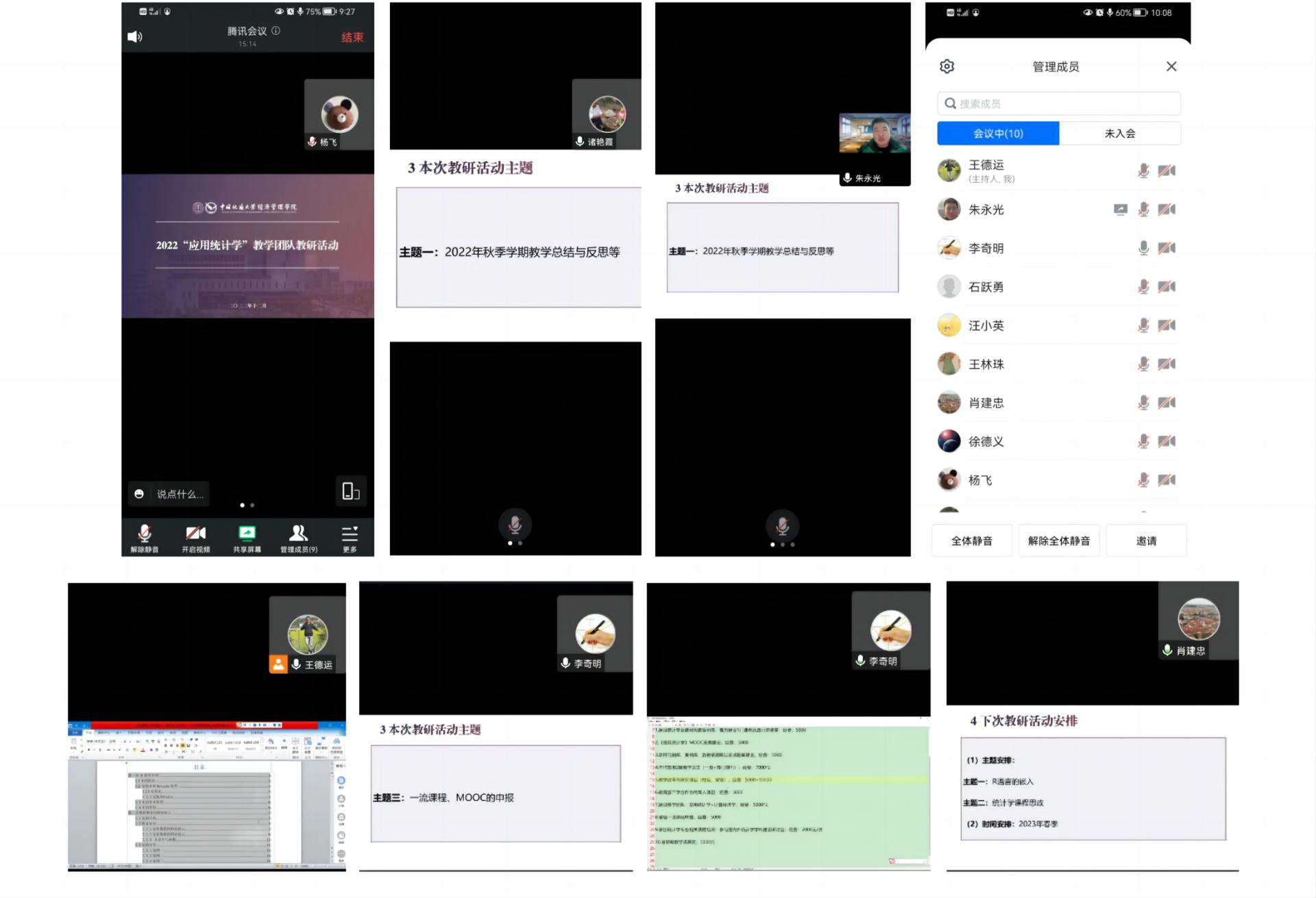 2022年12月8日,公司统计学教学团队于线上开展了第一次教研活动。本科生院副院长杨飞教授、公司副院长肖建忠教授全程参与了讨论并分别给出了建议或指导意见。统计学教学团队成员徐德义、李奇明、王德运、王林珠、汪小英、诸艳霞、石跃勇、朱永光等参加了本次活动。本次教研活动以2022年秋季学期教学总结与反思、配套教材的编写、一流课程申报三大主题展开,教学团队成员进行了充分的讨论,取得了良好效果。