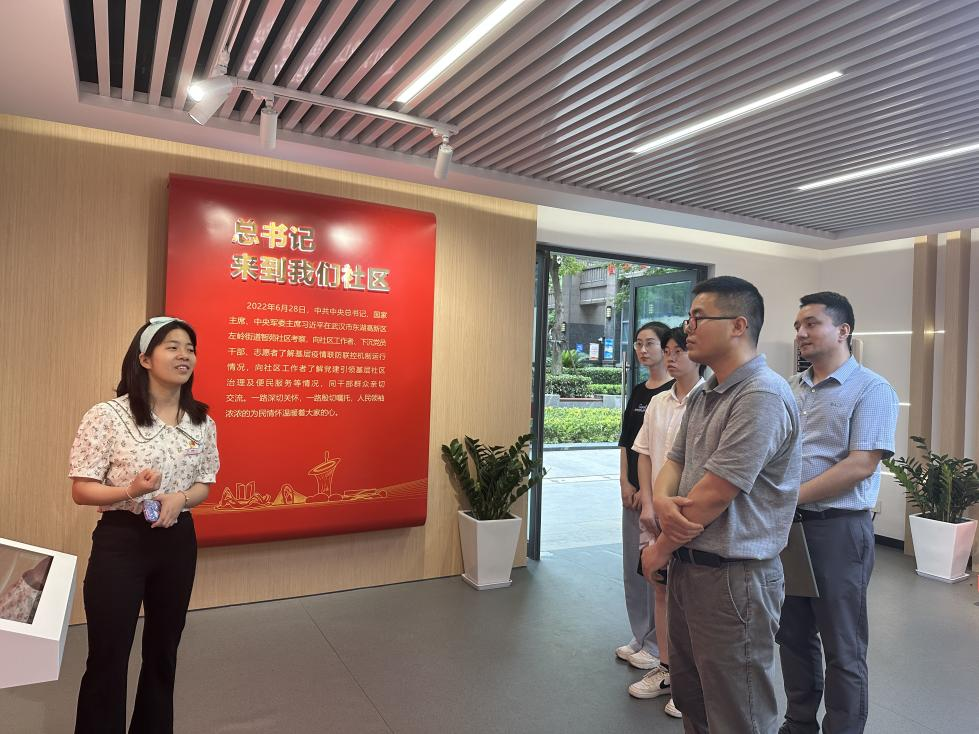 (通讯员 刘佳、李宜璋)6月5日下午,太阳成集团122ccvip党委副书记李少杰、团委书记努尔夏提·居勒提带领团学代表、全国“两弹一星”宣讲团成员代表走访左岭街道智苑社区,深入学习习近平总书记2022年6月28日在武汉考察时的重要讲话精神,推进学习贯彻习近平新时代中国特色社会主义思想主题教育走深走实。进一步强化学院与智苑社区地合作联系,引导学生走进基层一线,弘扬志愿奉献精神。智苑社区团支部书记金成静,党建专员李梦蝶,光谷壹新社工项目主管覃敏姣、熊南叶及社区干事参加座谈和“志愿服务实践基地”挂牌仪式。