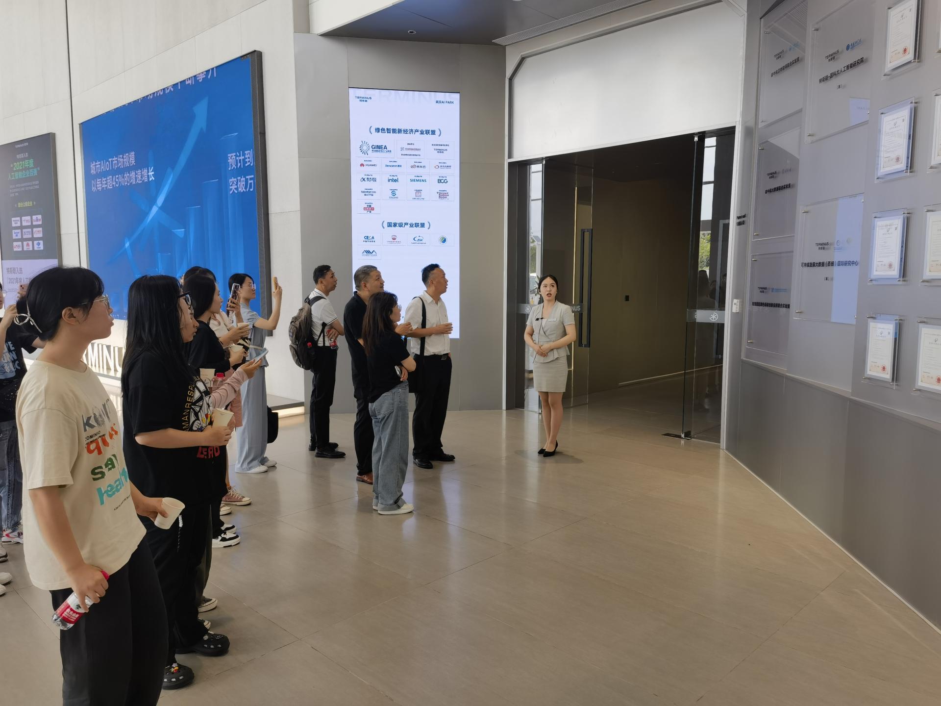 一行人参观了中法生态城规划展示馆。恢弘大气的全息沙盘模型生动展示了中法生态城的园区规划、区位优势和发展潜力;独具特色的5D场景体验让师生们直观感受到中法生态城建设“中法合作之城、低碳示范之城、产业创新之城、生态宜居之城”的宏伟蓝图,真切体会到蔡甸区的生态发展理念。师生随后参观了法资企业泰孚(武汉)汽车声学产品有限公司和光控特斯联智慧产业园,深入车间厂房、与企业高管面对面交流,进一步了解了园区内的企业经营业态和科技创新潜力。