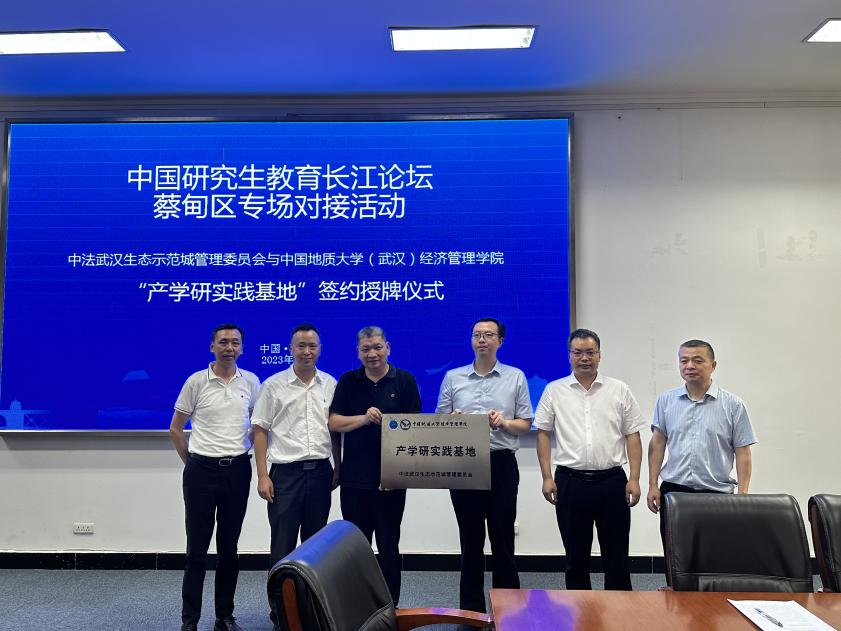 参观结束后,师生来到中法武汉生态城管委会,与蔡甸区委组织部,管委会人才办、招商处等相关领导座谈。我校优秀校友,蔡甸区委常委、组织部部长王呈华参与交流。双方围绕人才培养与输送、产学研融合发展等共同关心的话题进行深入交流,签署了校地战略合作协议。学院为中法武汉生态示范城管委会授牌“产学研实践基地”。