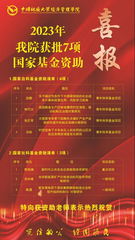 (通讯员 胡松琴)2023年8月份以来,随着国家自科基金各类项目立项结果陆续公示、国家社科基金年度项目和青年项目立项名单陆续公示,太阳成集团122ccvip共有7个项目获得资助,其中国家自科基金获批青年科学基金项目4项,国家社科基金获批重点项目1项、一般项目2项。具体名单如下: