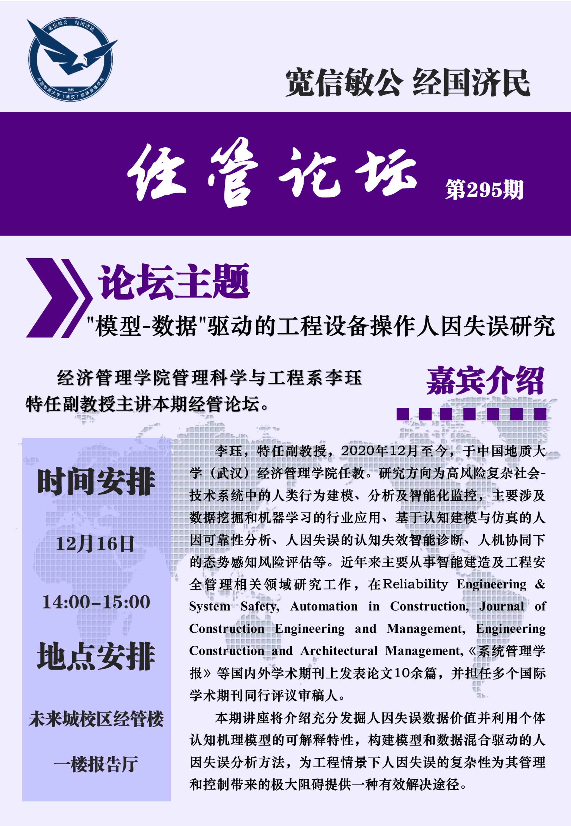 经管论坛(第295期)“模型-数据”驱动的工程设备操作人因失误研究