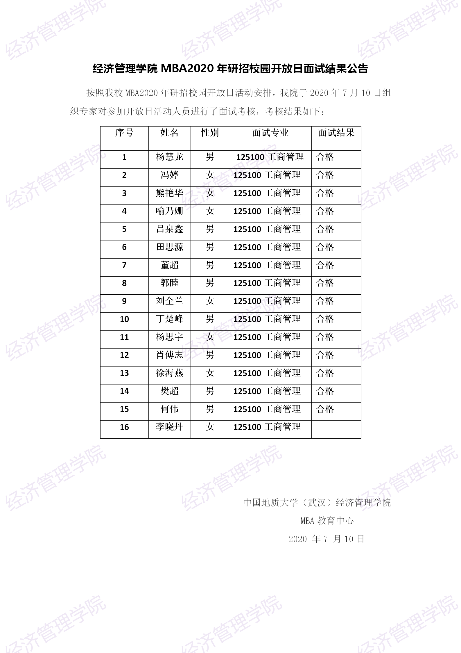 太阳成集团122ccvipMBA2020年研招校园开放日面试结果公告