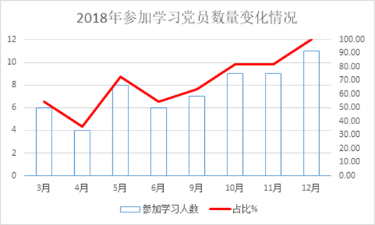 发挥支部政治引领功能,不断加强政治学习,牢固树立“四个意识”,在思想上行动上与党中央保持高度一致;坚持每月最后一个周四开展主题党日集中学习,保证做足规定动作;将主题党日与“三会一课”相结合,严格落实支部工作条例规定。全年政治学习党员参加情况统计见下图所示,学习氛围良好。
