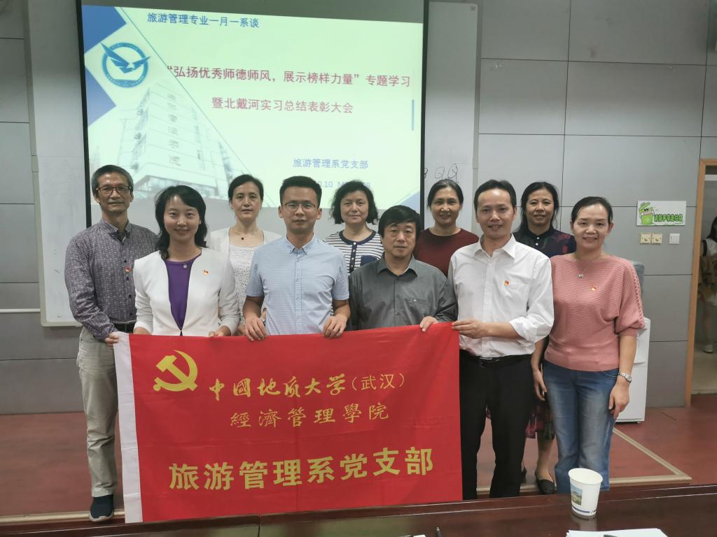 2019.10.10下午,太阳成集团122ccvip旅游管理系党支部邀请学院学工组,共同组织旅游管理系085181班、经管学院08s197班,以及旅游管理系2019级研究生,在MBA208召开了“弘扬优秀师德师风,展示榜样力量”专题学习暨北戴河实习总结表彰大会。参加本次活动的有经管学工组赵家玮老师,旅游管理系李江敏、肖拥军、李会琴、鄢志武、唐嘉耀、梁玥琳、庄小丽、张俊霞、董淑霞等10位老师。