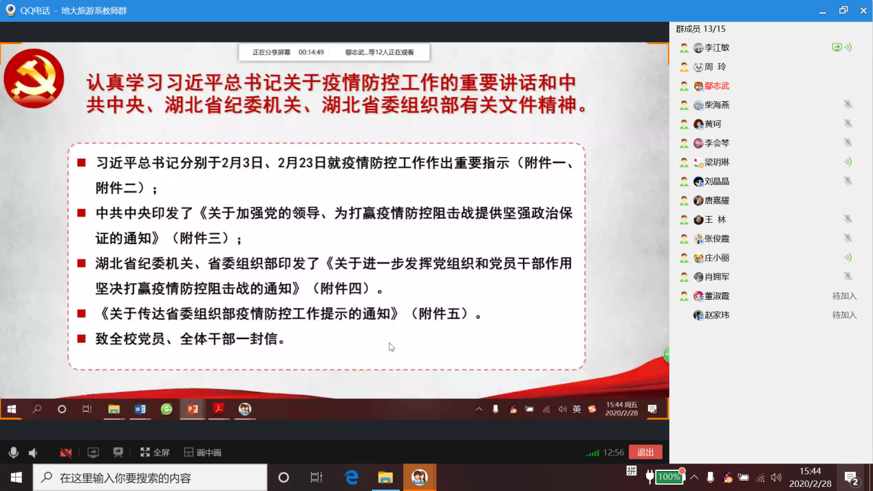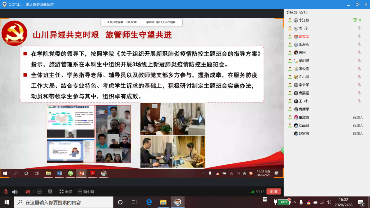 2020年2月28日下午,旅游管理系党支部以QQ电话会议的形式开展了以抗疫为主题的支部主题党日活动,旅游管理系党支部全体党员线上参加此次活动,支部外派挂职党员和群众教师线上列席此次活动。