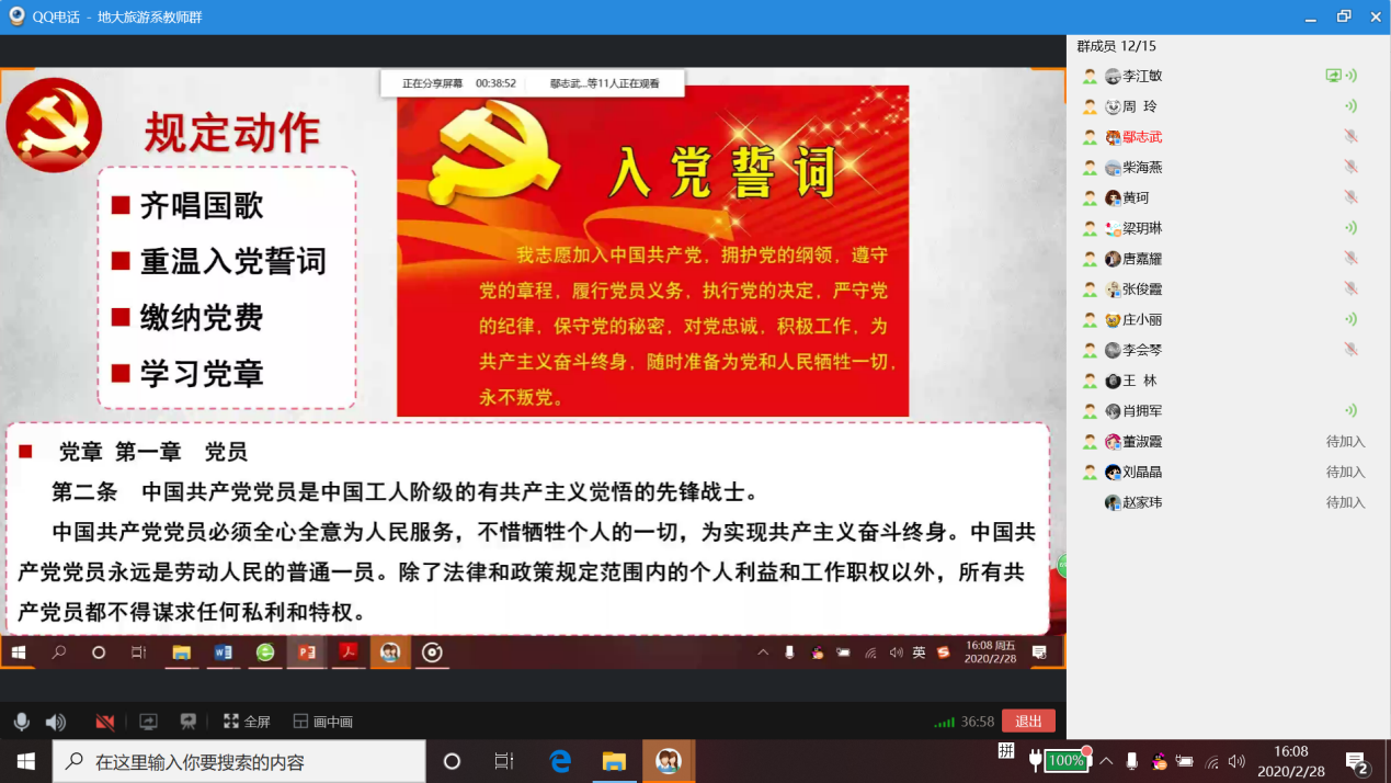 本次支部主题党日活动虽然采取的是线上QQ电话会议形式,但经过前期精心准备和安排,齐唱国歌、重温入党誓词、缴纳党费等规定动作仍一如既往地规范进行。在线上会议中,身处各地的党员们的国歌声和誓词声虽然因为网络延时原因而显得不那么同步和整齐划一,但神圣庄严感在每位党员的内心一如既往,抗疫的决心、必胜的信心、育人的初心在以同一频率奋发共振。(旅游管理系党支部宣)