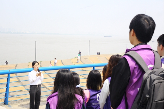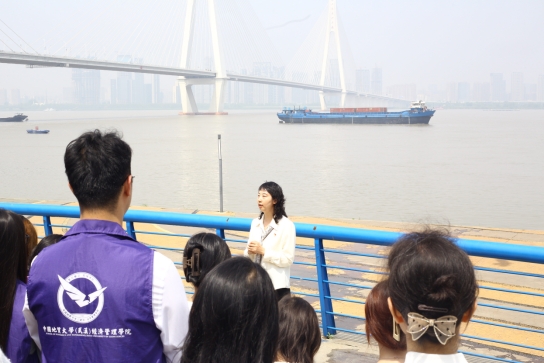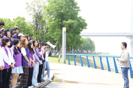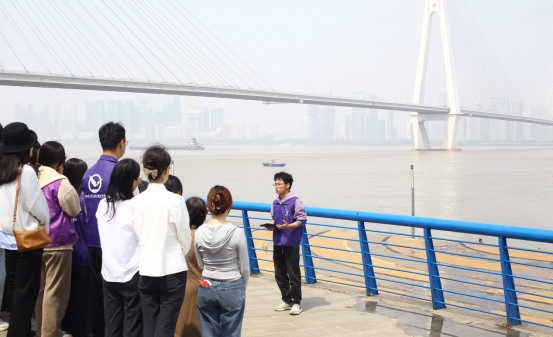 首先,楚江拾遗实践团负责人田林站在万里长江边,介绍了团队关于非物质文化遗产活态传承赋能长江国家文化公园建设路径的研究成果,以及他们如何通过“访江脉,传文脉,续文脉,载文脉”四位一体模式,用一项项丰富成果践行着习近平总书记“长江嘱托”的故事。团队打造“行走式”长江非遗课堂,推动科普宣讲进社区进校园进景区进支部,发起“美丽长江青春行动”志愿服务品牌,相关研究报告获湖北省国家文化公园建设工作领导小组采纳,实践过程及成果获湖北省文化和旅游厅回函肯定,同时连续三年获评湖北省“三下乡”优秀实践团队,还获得“挑战杯”红色专项国家二等奖。他们让聆听的学生真切感受到“烟笼寒水月笼沙,不止灵秀与樱花!”