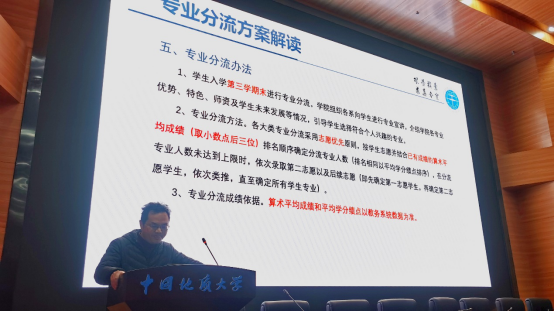 会议开始,教务科石磊老师对学校、学院的专业分流实施方案进行了解读。本科生按大类招生的政策体现了以学生的全面发展为最终目标,以培养宽口径、厚基础、高素质、强能力,具有创新精神的复合型高级经济和管理人才为具体目标的宗旨。按照“打通”培养和“分段”培养相结合的方式,学生进校后前1.5年,以通识教育课和大类基础课学习为主,学院针对“三个大类”和“一个专业”开设统一的大类基础课(学科平台课程),以为学生更好地学习专业课程和未来的发展奠定宽广而坚实的基础。公司工商管理大类按照分流要求,计划分为工商管理(双语班)、市场营销、会计学和旅游管理四个细分专业,大类专业分流采用公开、公平、公正的以志愿与专业规模适度平衡相结合、学生志愿与学习成绩相结合的原则,按学生志愿并结合已有成绩的算术平均成绩排名顺序确定分流专业人数,在分流专业人数未达到上限时,依次录取第二志愿以及后续志愿。