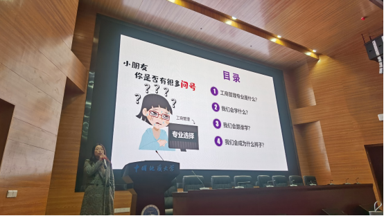 随后,工商大类各系代表教师进行专业分流宣讲。市场营销系郭锐老师就市场营销专业进行了正确解读,他指出营销不等于推销,营销是企业工作的核心;他还对营销系课程安排、师资队伍以及就业前景进行了简单的介绍。张京老师针对公司工商管理专业双语教学的办学特色着重进行了介绍,分享了往届工商管理双语班毕业生的就业和升学去向,并将往届优秀毕业生精心准备的介绍和祝福视频带到了宣讲会。会计系杨洁老师分析了会计学科的发展方向,指出财务人员在未来不仅不会被淘汰,反而需求巨大,此外她还对学生未来深造方向、就业去向进行了解读。旅游管理系肖拥军老师从旅游业发展视角出发,向同学们介绍了专业培养项目、专业发展前景,解决了学生在就业方向上的疑惑。各系宣讲后,在互动交流环节中同学们积极向老师提出专业发展、升学、就业等方面问题,老师们为其答疑解惑、指点迷津。