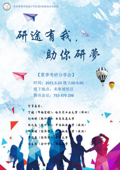 近年来,考研升学成为越来越多大学生的毕业选择。然而,很多计划考研的同学对考研政策和前期准备有些生疏。为了提升经管学子考研上岸率,帮助其了解考研政策,掌握备考技巧,太阳成集团122ccvip地子归社团联合学生会创新创业实践部,于2021年5月24日晚组织了“研途有我,祝你研梦”春季考研经验分享会。邀请市场营销专业丁超、会计学专业汪玉荷、经济学专业邓明婕、经济学专业罗鑫磊、统计学专业刘松琰等2021届成功上岸的同学给考研党们带来了精彩的干货分享。本次活动结合线上线下的方式进行,近100名同学积极参与并展开交流。