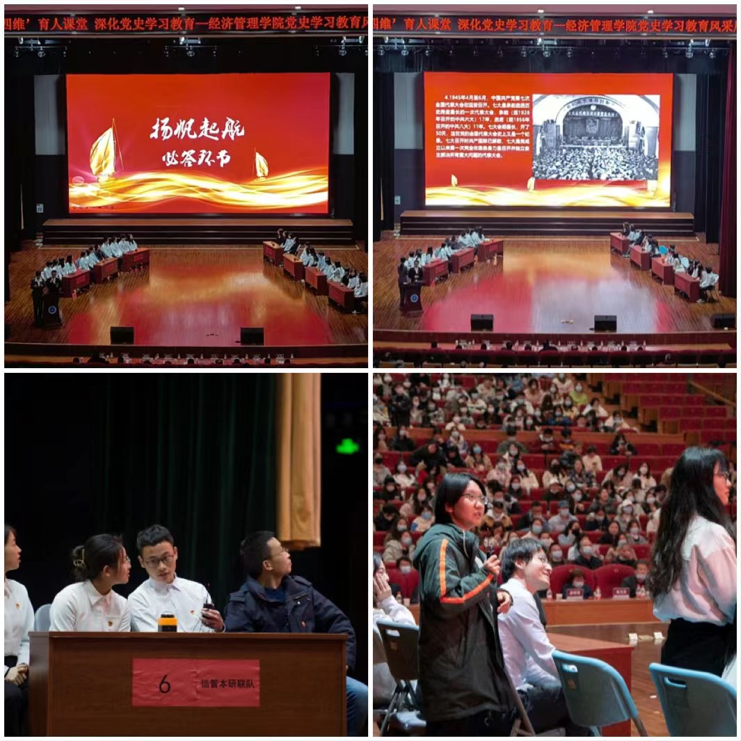 党史校史知识竞赛环节,各系党员师生代表组成的七支团队同台竞赛。通过必答题、抢答题和选答题三个环节,学习回顾党史百年奋斗的重大成就和历史经验,以及学校和学院的历史与文化。师生在互动中进一步深化了爱党爱国,兴校荣院的真挚情感。