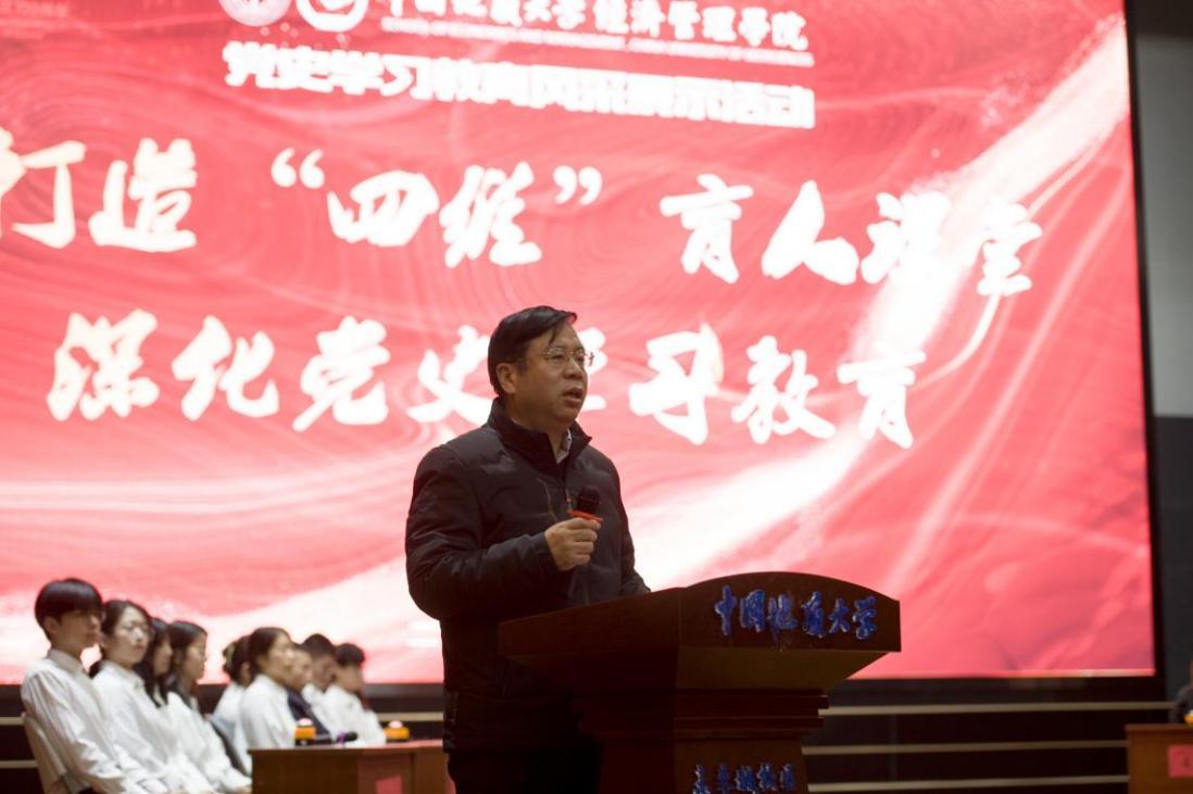 唐辉明作总结讲话。他充分肯定了经管学院党委开展党史学习教育的阶段性成效和此次“四维”课堂展示活动,并带领在场师生深入学习了党的十九届六中全会精神。他指出,学院党委要切实担负起主体责任,深入推进党史学习教育。一是要深化理论研究阐释,立足学科特色创新建设课程思政和通识课程,将十九届六中全会精神有机融入教育教学,实现思政课程与课程思政深度融合,促进十九届六中全会精神进课堂、进教材、进头脑。二是要深入推进“我为师生办实事”实践活动,打好党史学习教育“收官战”。要推动“办实事”与育人实践有效融合,与社会实践活动、志愿服务活动相结合,培养青年学子专业报国情怀,增强知行合一本领。他勉励广大师生,切实将党史学习教育成效转化为“开新局”的强大动力,营造干事创业的良好氛围,推动学院事业发展再上新台阶。
